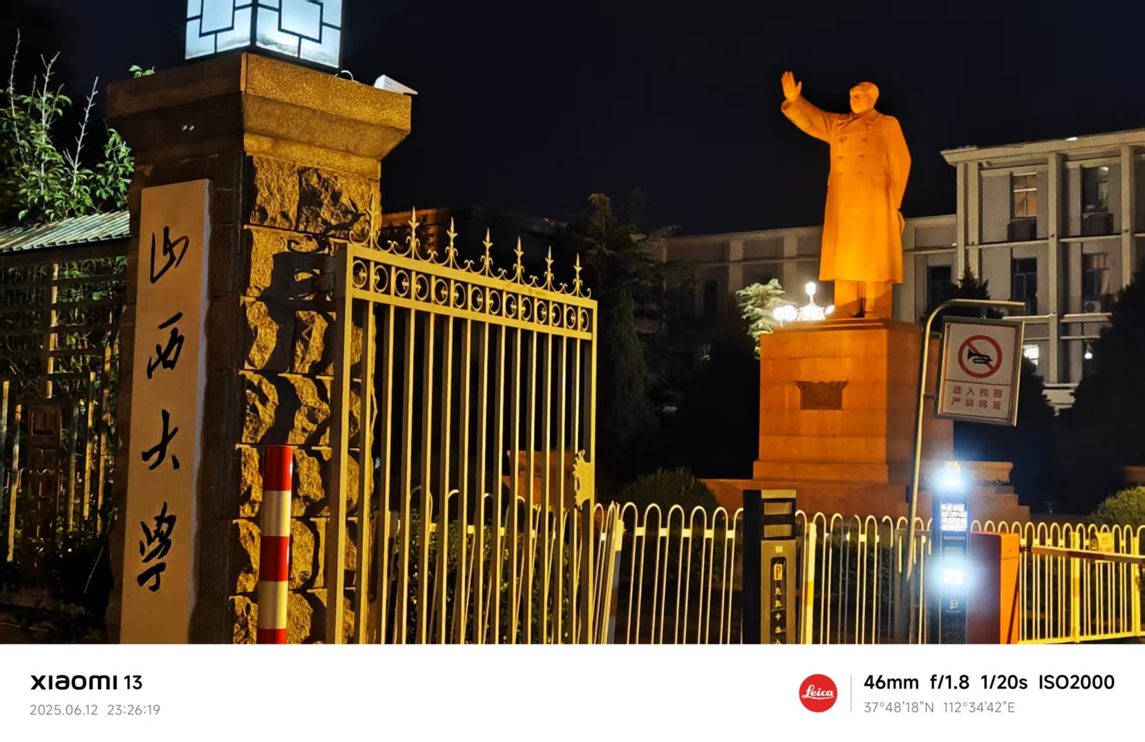 没有学生证,自然是进不去的。那就继续前行,很快就到了西北门,这个小门开着闸机,夜晚外出的学生不时路过。西门里有一尊伟人的雕塑,甚是雄伟。爱人当年就读的教师就在雕塑后面。楼层不高,夜色昏暗,看不出细节,这栋楼有年代了。